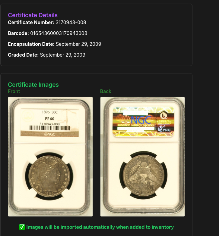 We integrate with PCGS, NGC, NGC Ancients, CACG and ANACS